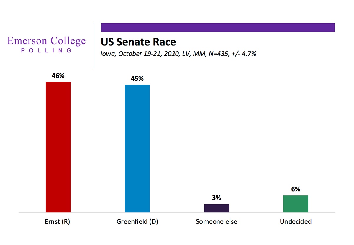 Below is a chart over time of the models estimate of each partys chance of winning iowa. According to a mid september des moines registermediacom iowa poll 31 of likely voters polled said the economy was the most important issue in the election. Theresa greenfield defeated michael franken kimberly graham and eddie mauro to win the democratic primary for us.